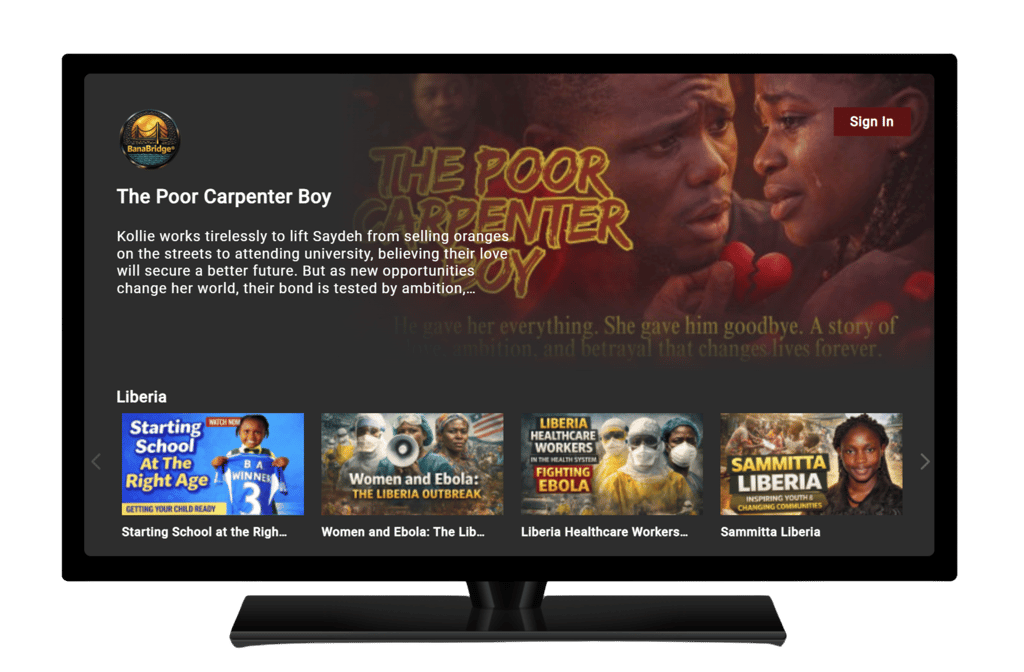 BanaBridge TV is our streaming platform dedicated to films, series, documentaries, comedy, and cultural programming from underrepresented African countries and their diasporas. Built for accessibility and global reach, it provides a home for authentic stories that rarely receive international distribution, while creating new opportunities for local filmmakers and storytellers.
